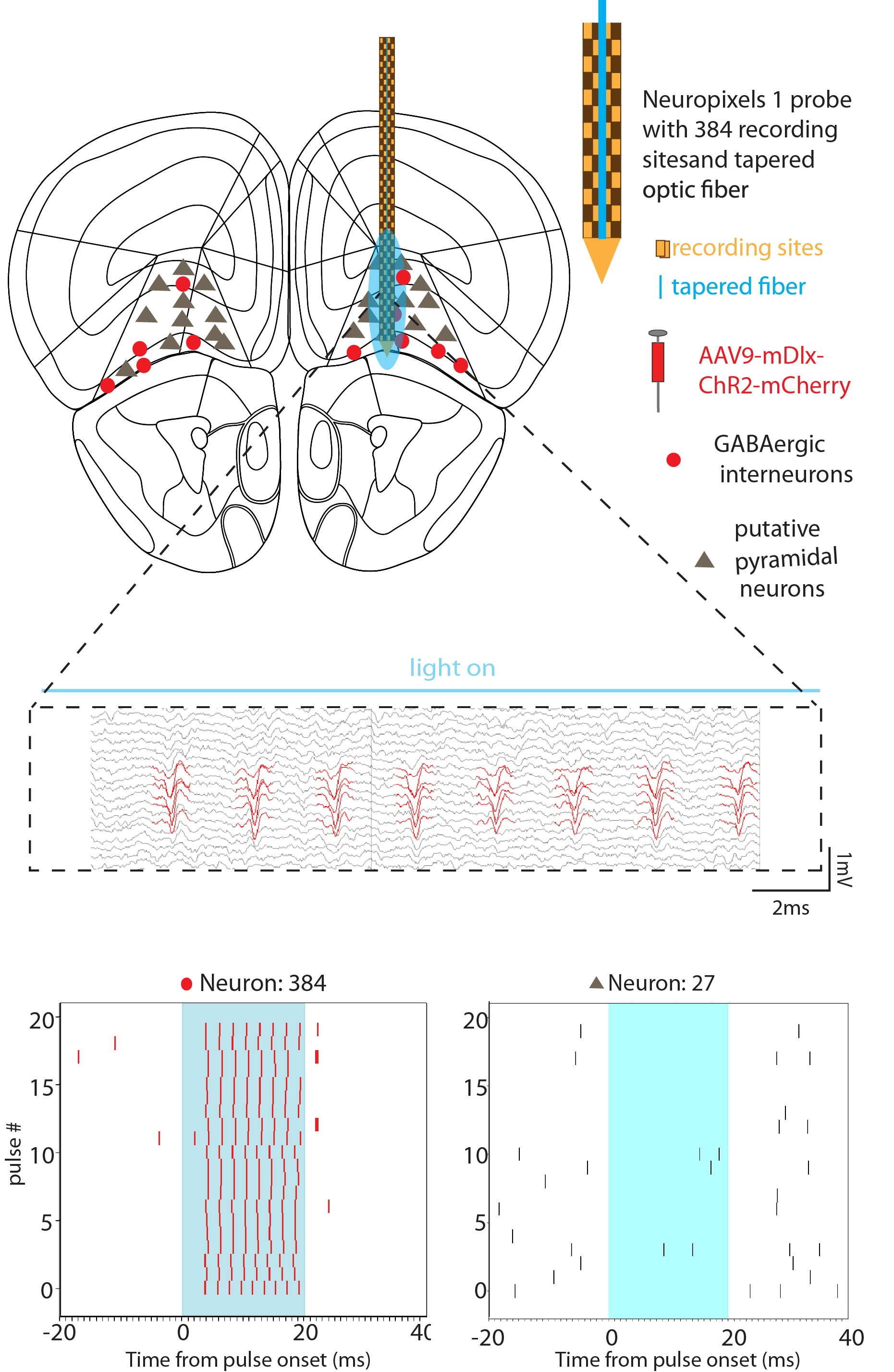 We use silicon probes and Neuropixels electrodes to record the action potentials of hundreds of individual neurons simultaneously during task performance. In addition, we record the local field potential across different layers to perform current-source-density analysis for investigating network oscillations during cognitive behaviour. These recordings are analysed by sophisticated computational examinations.
