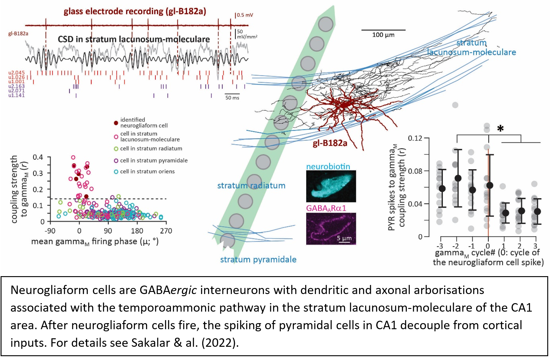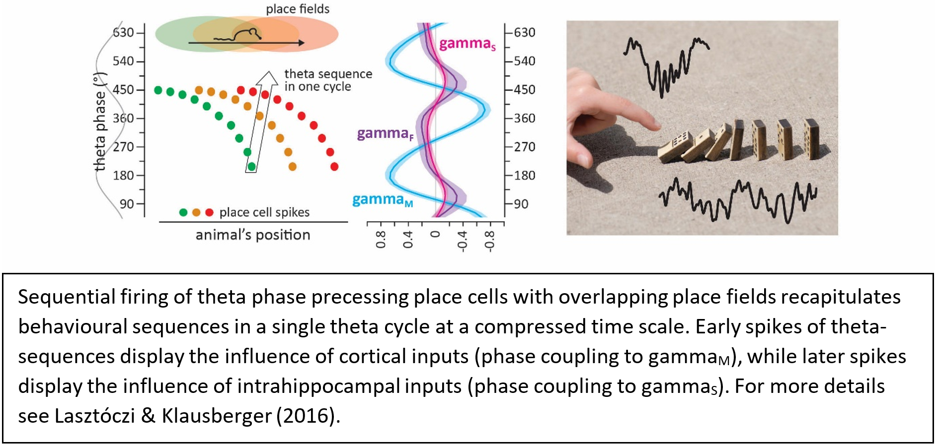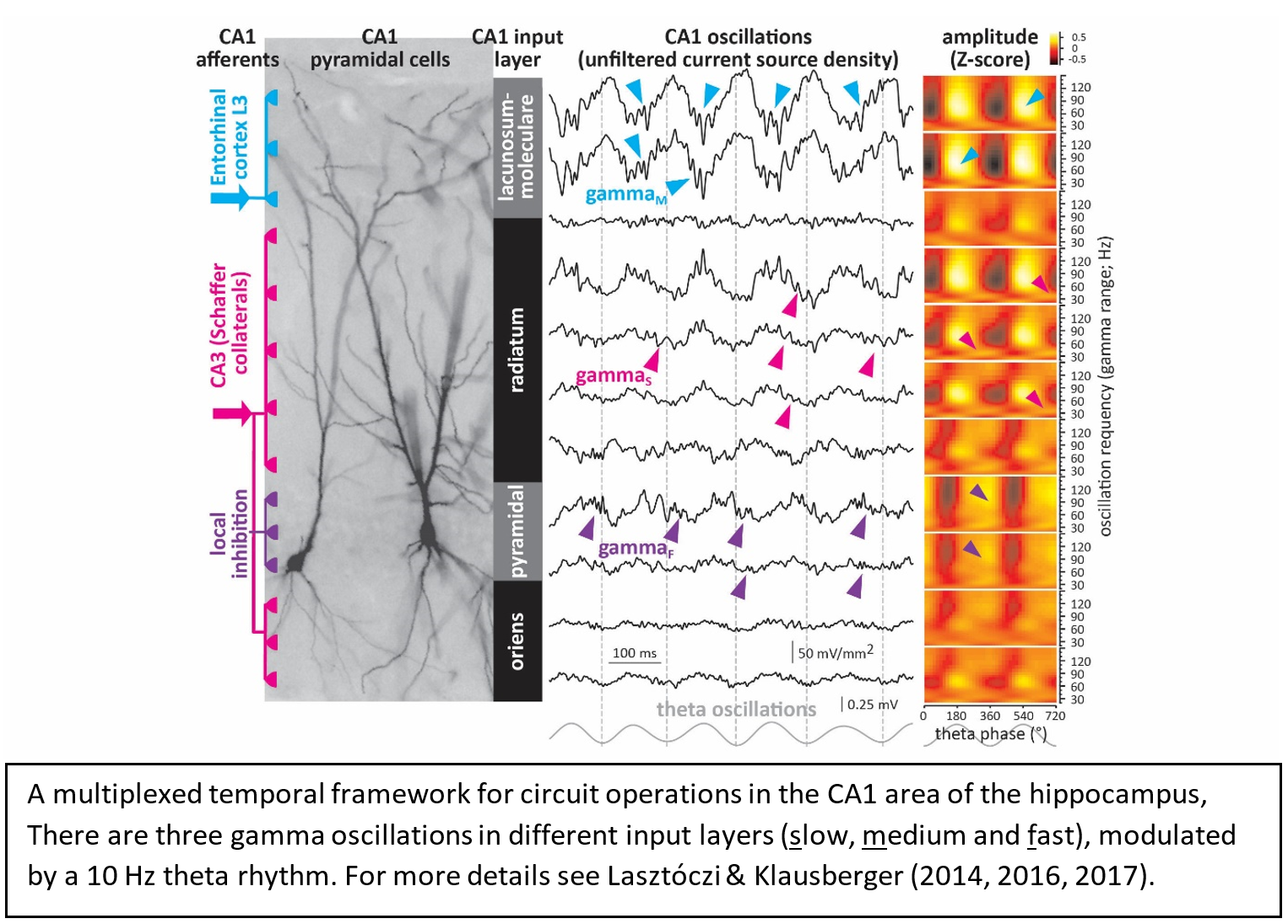 The goal of our research is to understand how network operations and ultimately the regulation of behaviour emerges from the collective temporal dynamics in neuronal circuits of the rodent brain. We take an experimental approach based on recording extracellular field potentials from awake animals by multi-electrode arrays which allow analytical separation of neuronal oscillations emanating from various anatomically segregated and physiologically relevant sources. Our primary concern is neuronal activity in the CA1 area of the hippocampus, which lies at the confluence of input streams carrying information on current experiences and memories and plays key role in spatial navigation and episodic memory. The coordination of these anatomically segregated input streams and the local network operations of the CA1 area is supported by a complex system of interacting neuronal oscillations that provide a multiplexed temporal framework for information processing.